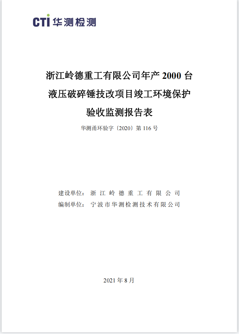 浙江嶺德重工有限公司年產(chǎn) 2000臺(tái)液壓破碎錘項(xiàng)目竣工環(huán)境保護(hù)驗(yàn)收公示